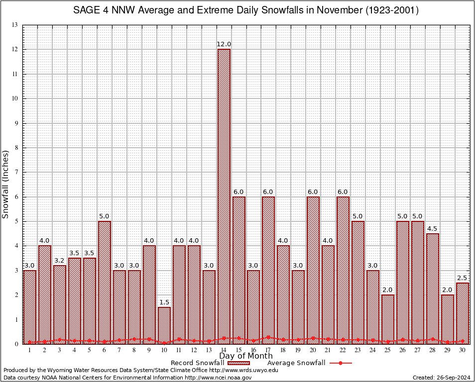 SAGE 4 NNW (487955) November Average and Extreme Daily Snowfall AMounts (1923-2001) To index page for SAGE 4 NNW