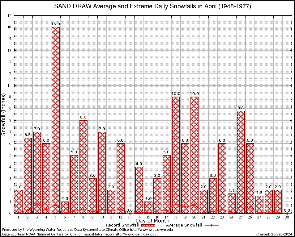 April Average and Extreme Daily Snowfall AMounts (1948-1977)