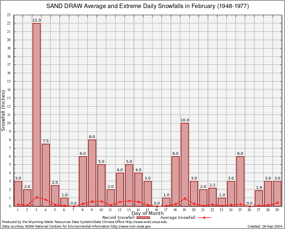 SAND DRAW (487980) February Average and Extreme Daily Snowfall AMounts (1948-1977) To index page for SAND DRAW