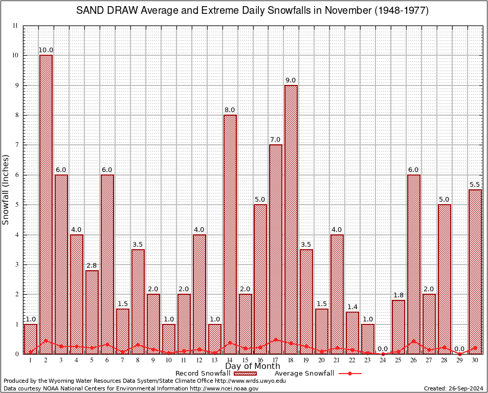 SAND DRAW (487980) November Average and Extreme Daily Snowfall AMounts (1948-1977) To index page for SAND DRAW