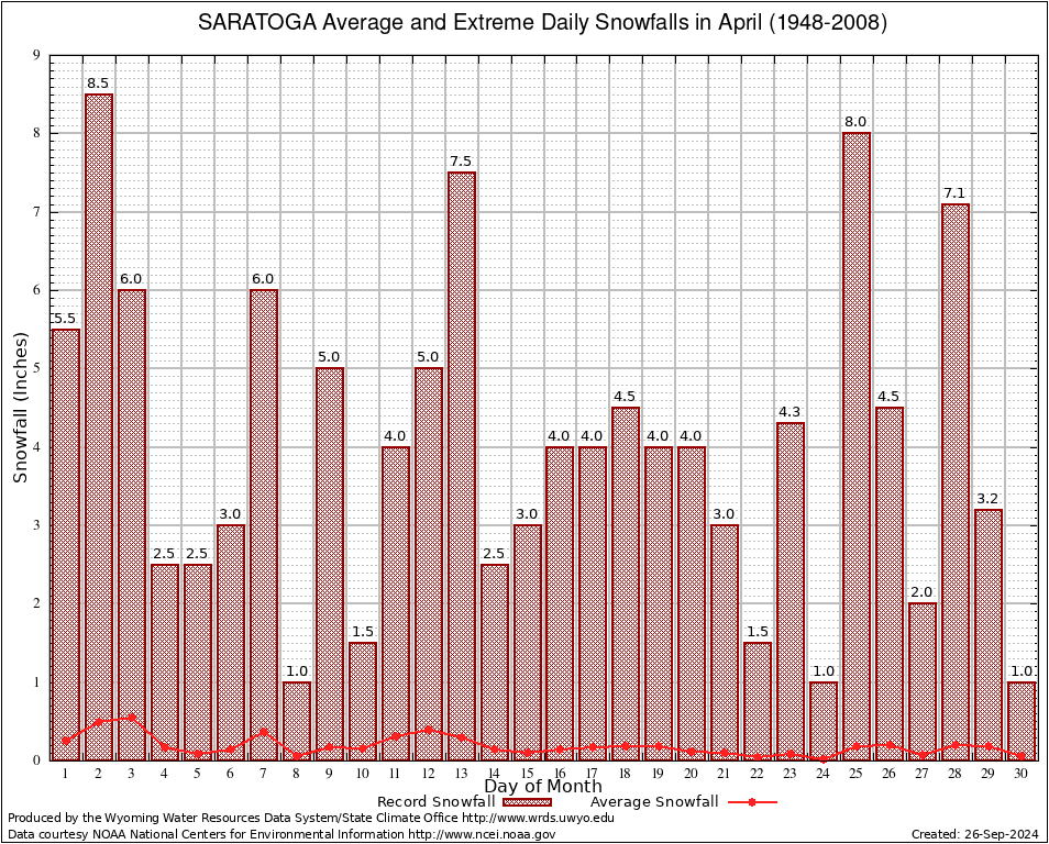 SARATOGA (487990) April Average and Extreme Daily Snowfall AMounts (1948-2008) To index page for SARATOGA