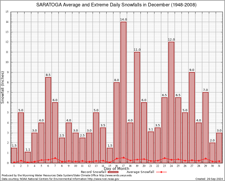 SARATOGA (487990) December Average and Extreme Daily Snowfall AMounts (1948-2008) To index page for SARATOGA