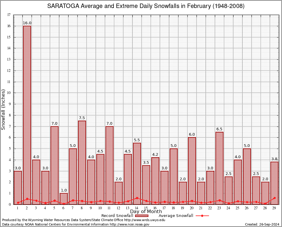 SARATOGA (487990) February Average and Extreme Daily Snowfall AMounts (1948-2008) To index page for SARATOGA