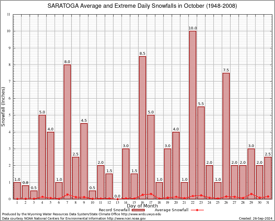 SARATOGA (487990) October Average and Extreme Daily Snowfall AMounts (1948-2008) To index page for SARATOGA