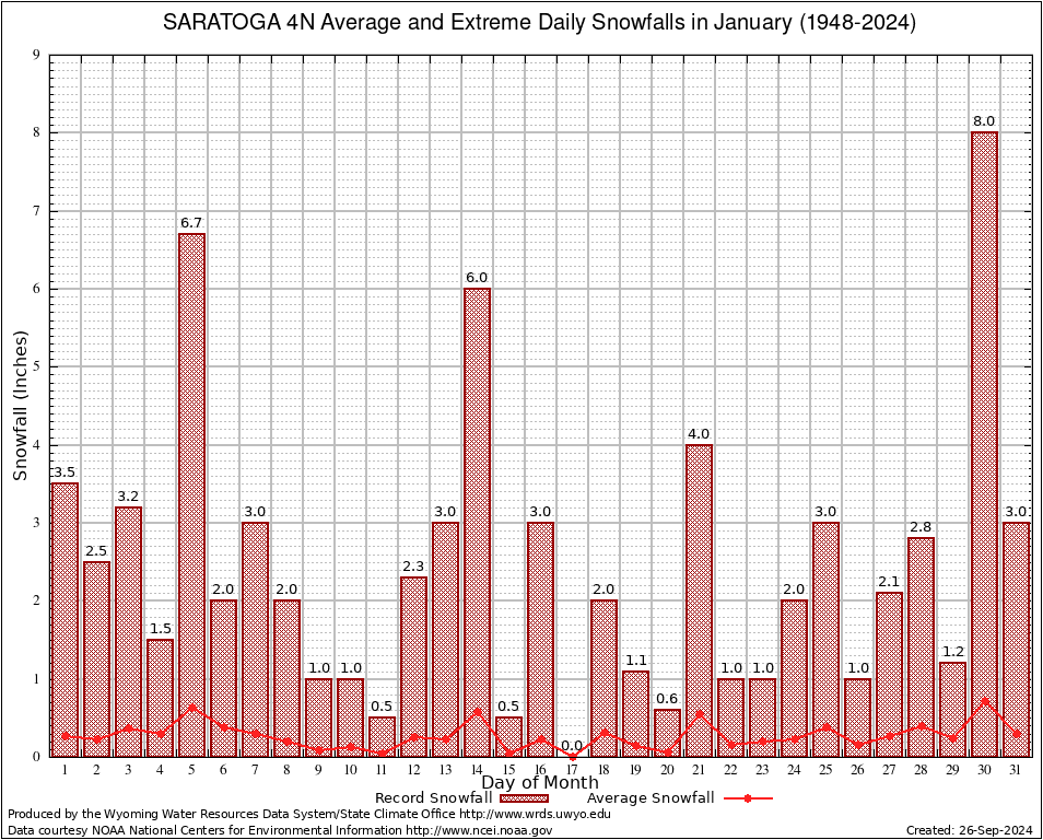 January Average and Extreme Daily Snowfall AMounts (1948-2024)