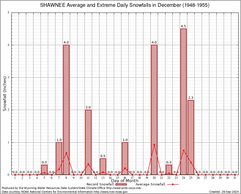 SHAWNEE (488095) December Average and Extreme Daily Snowfall AMounts (1948-1955) To index page for SHAWNEE