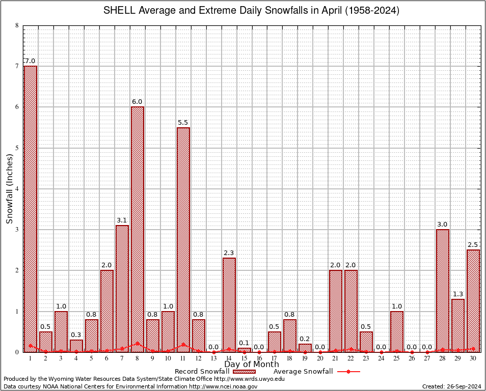 SHELL (488124) April Average and Extreme Daily Snowfall AMounts (1958-2024) To index page for SHELL
