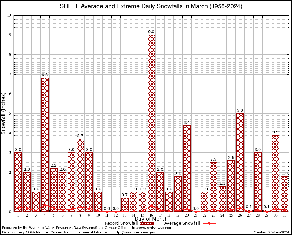 SHELL (488124) March Average and Extreme Daily Snowfall AMounts (1958-2024) To index page for SHELL