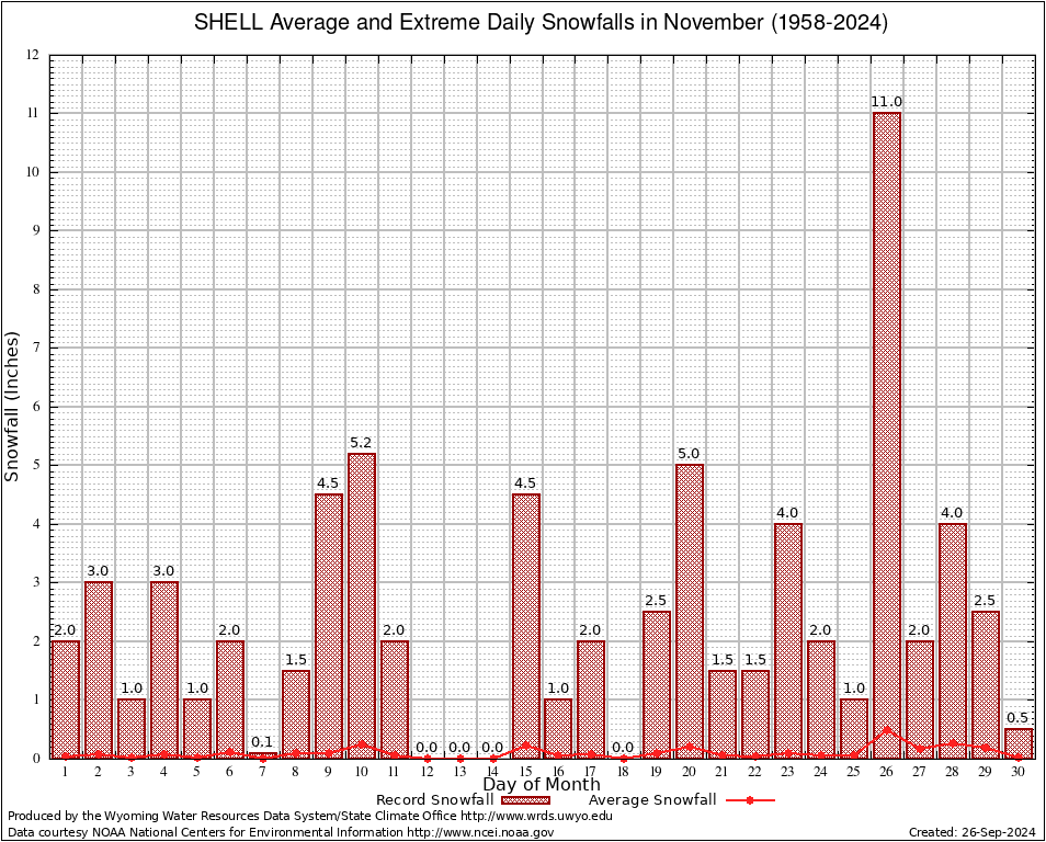 SHELL (488124) November Average and Extreme Daily Snowfall AMounts (1958-2024) To index page for SHELL