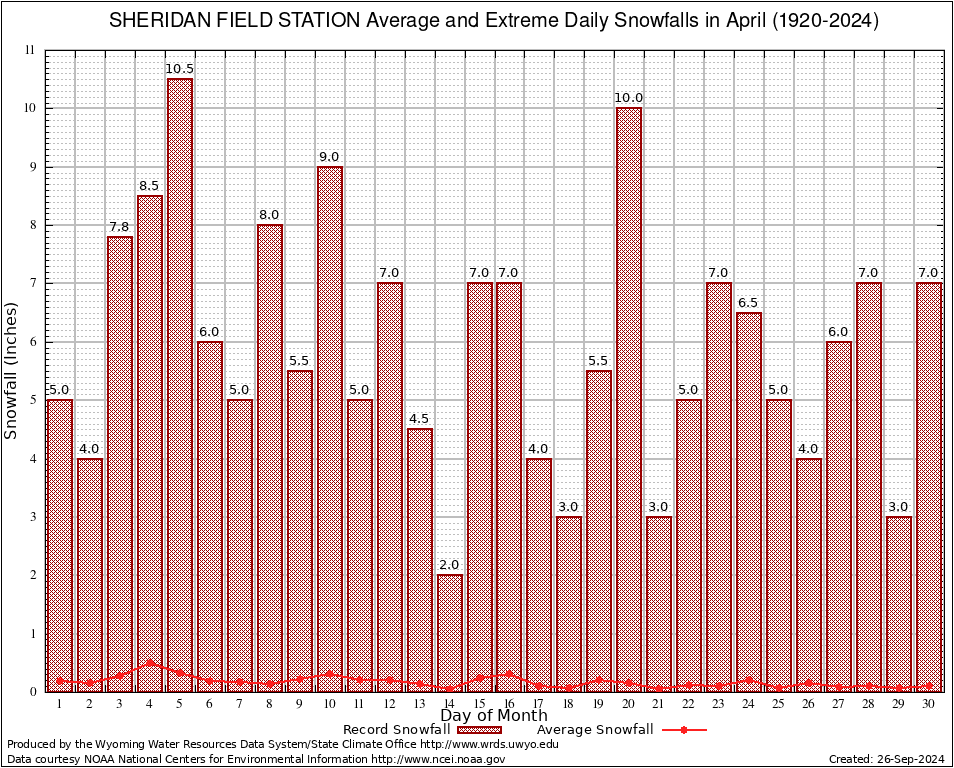 April Average and Extreme Daily Snowfall AMounts (1920-2024)