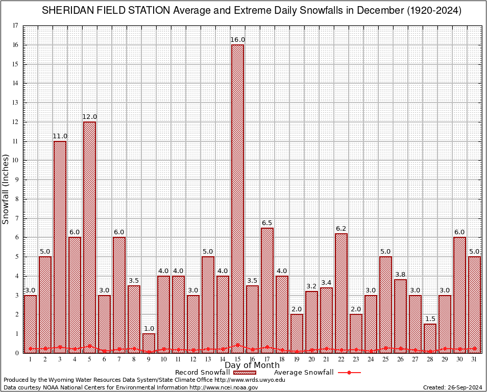 December Average and Extreme Daily Snowfall AMounts (1920-2024)