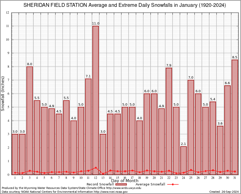 January Average and Extreme Daily Snowfall AMounts (1920-2024)