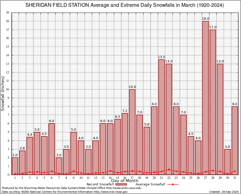 March Average and Extreme Daily Snowfall AMounts (1920-2024)
