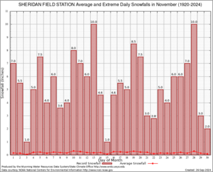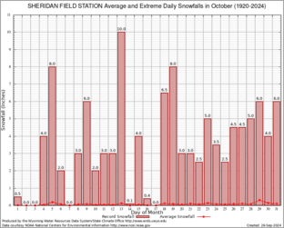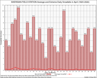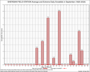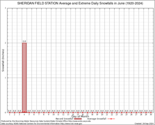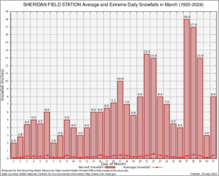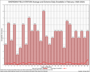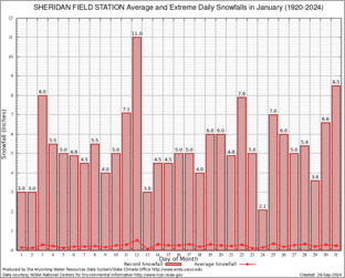 SHERIDAN FIELD STATION (488160) Record Extreme and Average Daily Snowfall (1920-2024) See Here for Other Stations