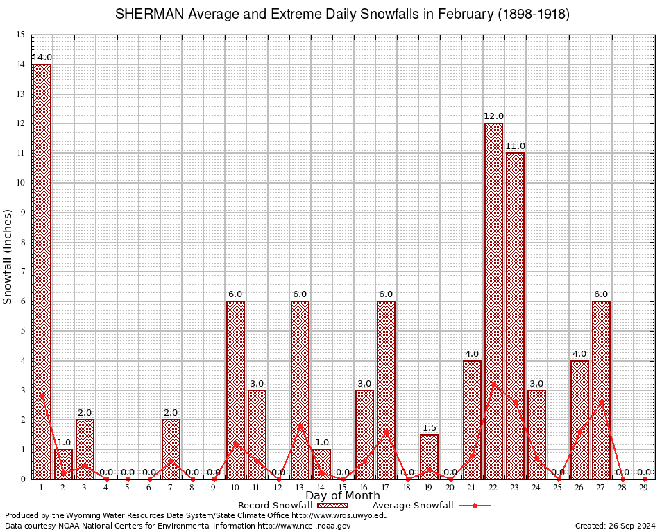 SHERMAN (488170) February Average and Extreme Daily Snowfall AMounts (1898-1918) To index page for SHERMAN