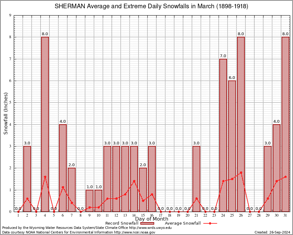 SHERMAN (488170) March Average and Extreme Daily Snowfall AMounts (1898-1918) To index page for SHERMAN