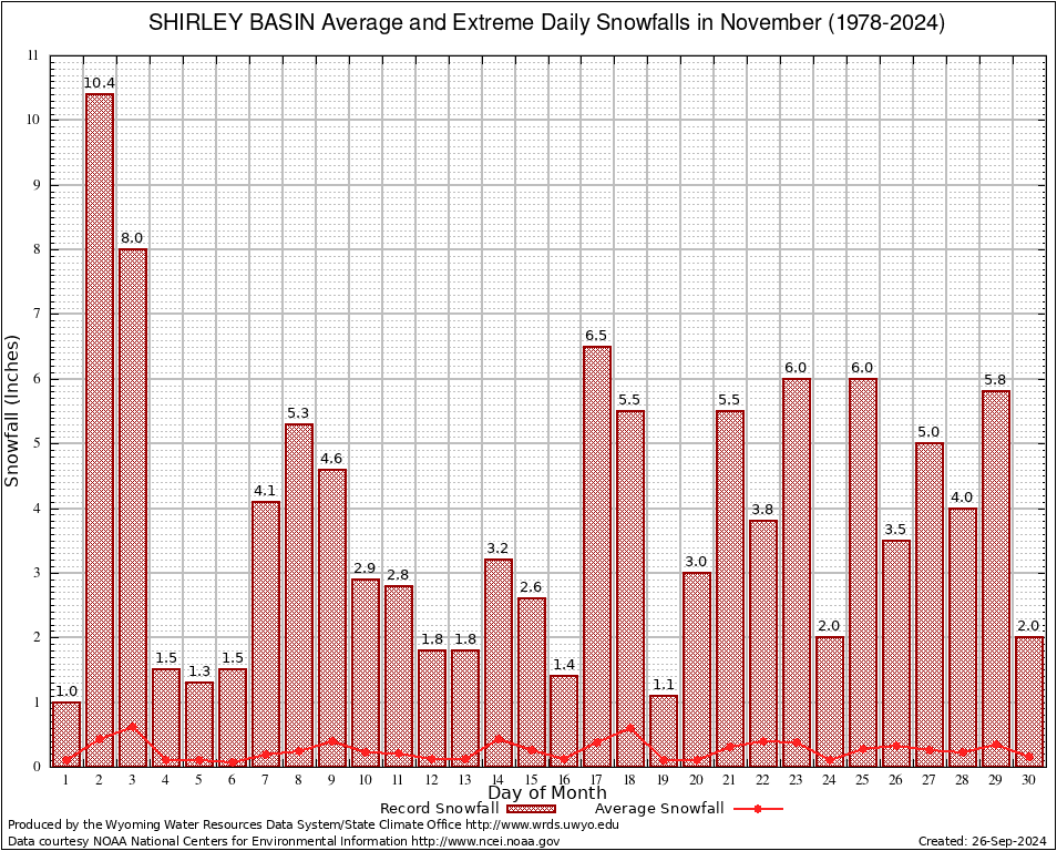November Average and Extreme Daily Snowfall AMounts (1978-2024)