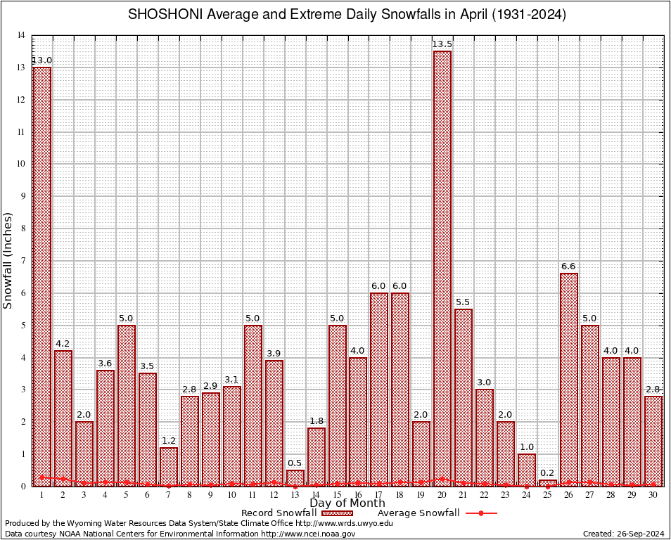 SHOSHONI (488209) April Average and Extreme Daily Snowfall AMounts (1931-2024) To index page for SHOSHONI