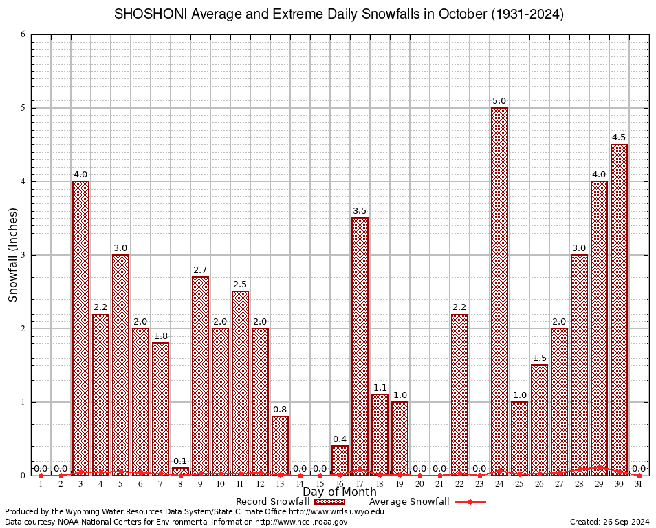 SHOSHONI (488209) October Average and Extreme Daily Snowfall AMounts (1931-2024) To index page for SHOSHONI