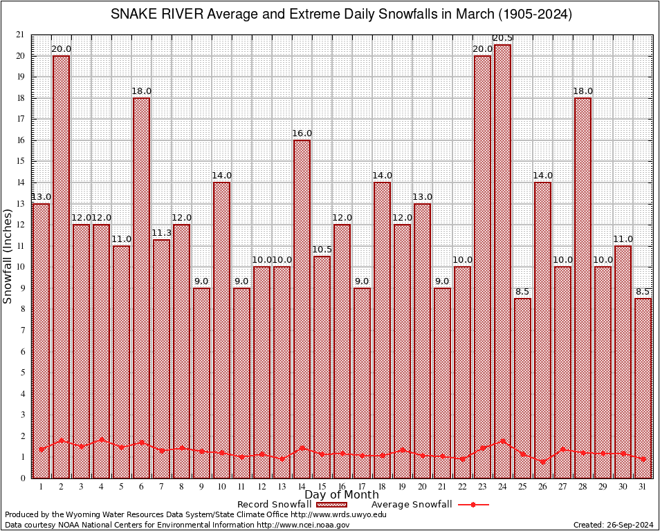 March Average and Extreme Daily Snowfall AMounts (1905-2024)