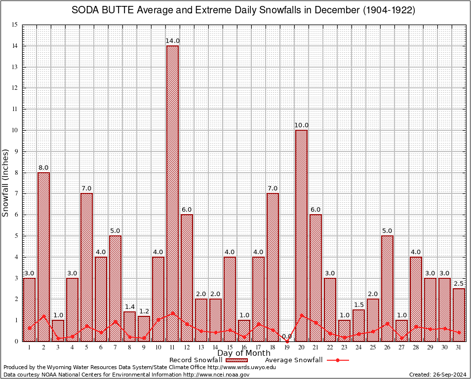 SODA BUTTE (488340) December Average and Extreme Daily Snowfall AMounts (1904-1922) To index page for SODA BUTTE