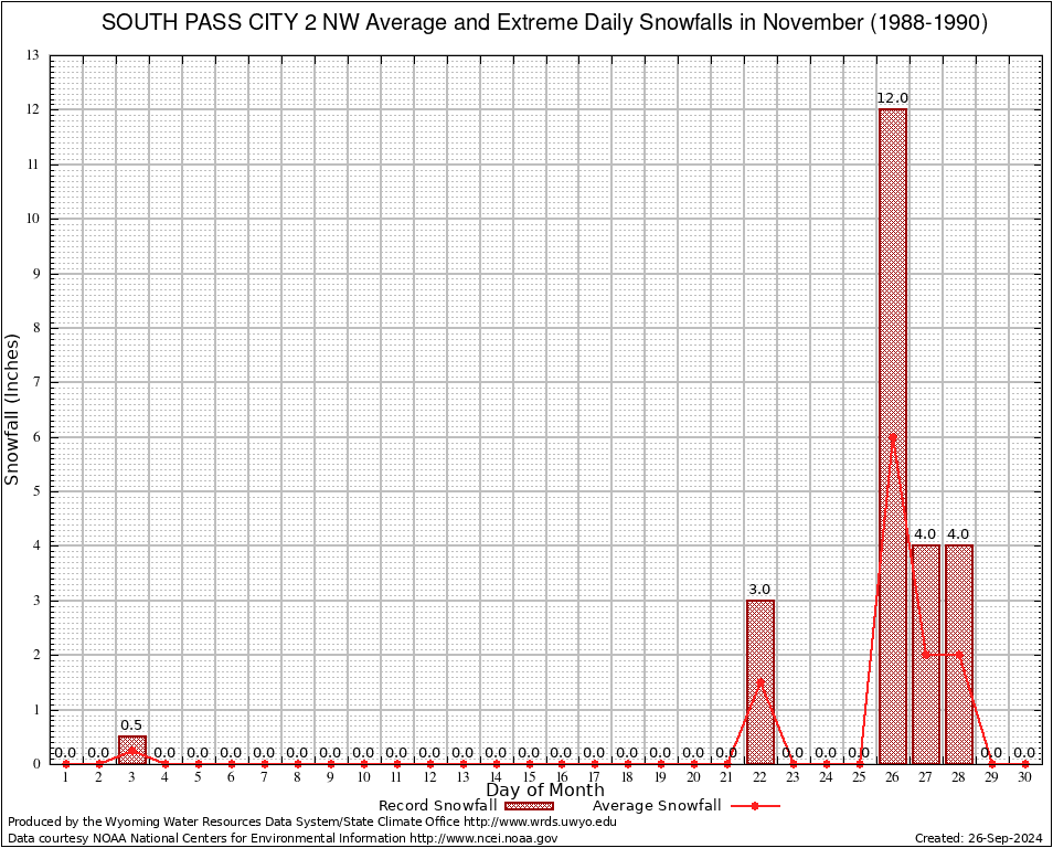 November Average and Extreme Daily Snowfall AMounts (1988-1990)