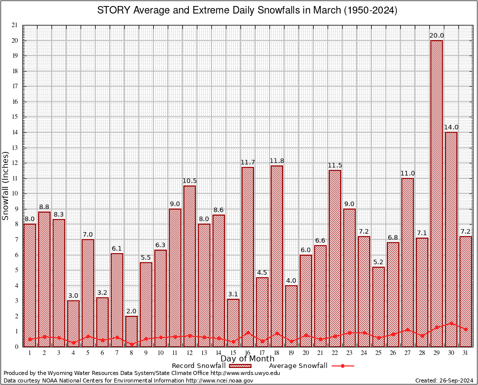 STORY (488626) March Average and Extreme Daily Snowfall AMounts (1950-2024) To index page for STORY