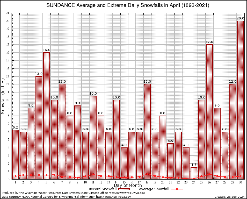 SUNDANCE (488705) April Average and Extreme Daily Snowfall AMounts (1893-2021) To index page for SUNDANCE
