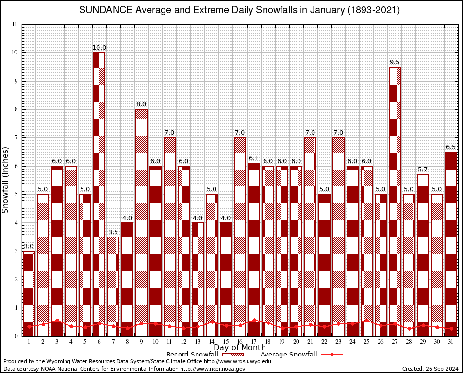 SUNDANCE (488705) January Average and Extreme Daily Snowfall AMounts (1893-2021) To index page for SUNDANCE
