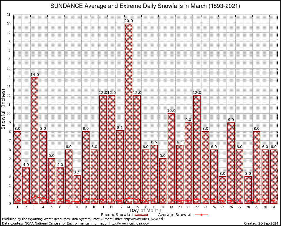 SUNDANCE (488705) March Average and Extreme Daily Snowfall AMounts (1893-2021) To index page for SUNDANCE