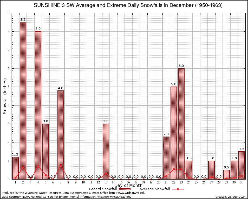 December Average and Extreme Daily Snowfall AMounts (1950-1963)