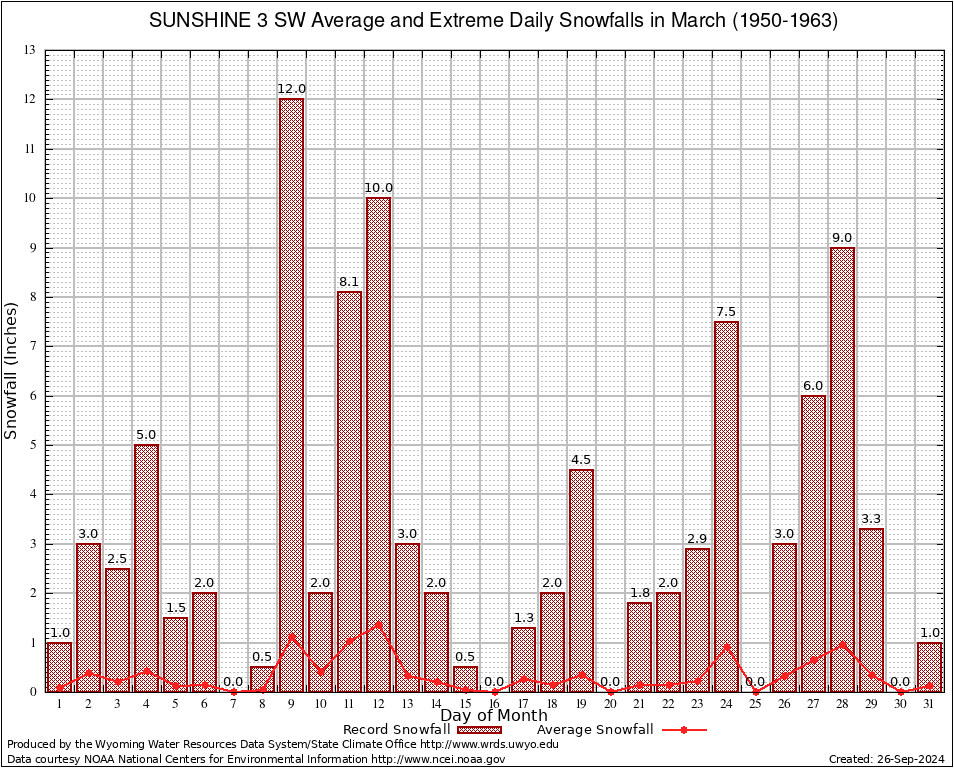 March Average and Extreme Daily Snowfall AMounts (1950-1963)