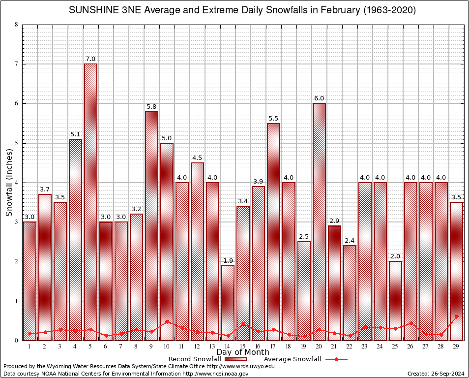 February Average and Extreme Daily Snowfall AMounts (1963-2020)