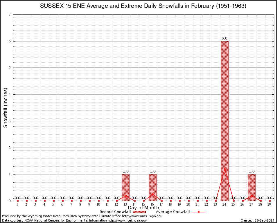 February Average and Extreme Daily Snowfall AMounts (1951-1963)