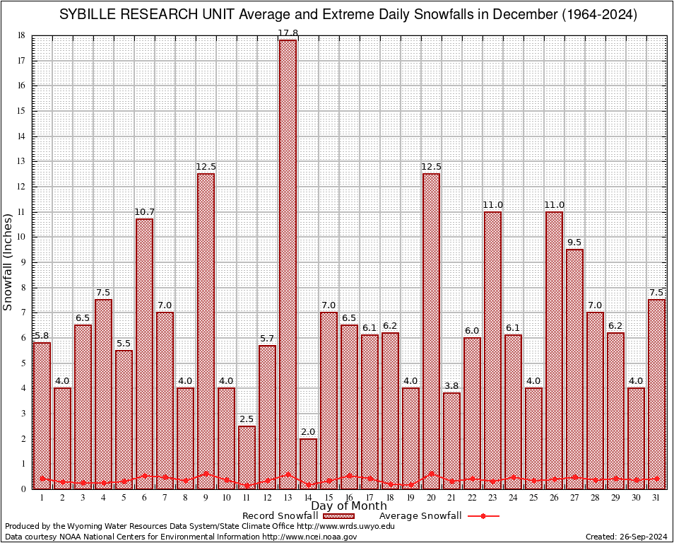 December Average and Extreme Daily Snowfall AMounts (1964-2024)
