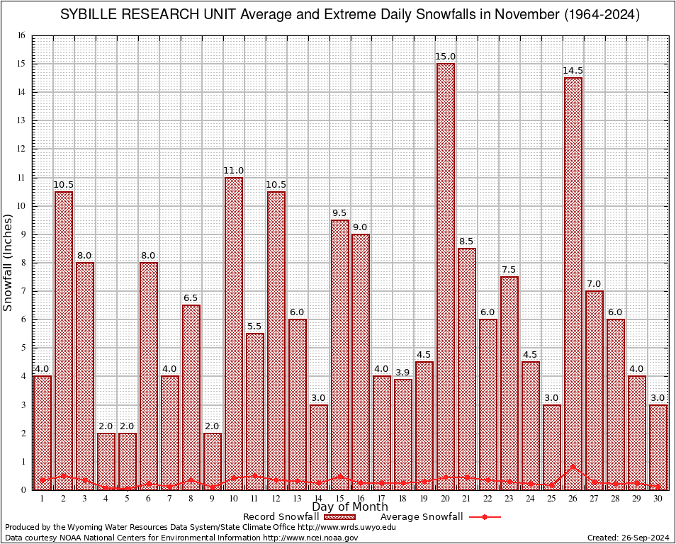 November Average and Extreme Daily Snowfall AMounts (1964-2024)