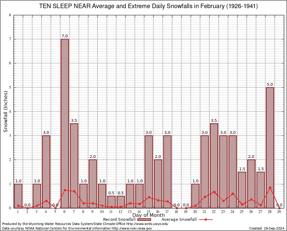 February Average and Extreme Daily Snowfall AMounts (1926-1941)