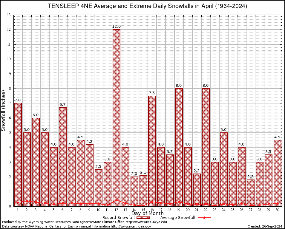 April Average and Extreme Daily Snowfall AMounts (1964-2024)