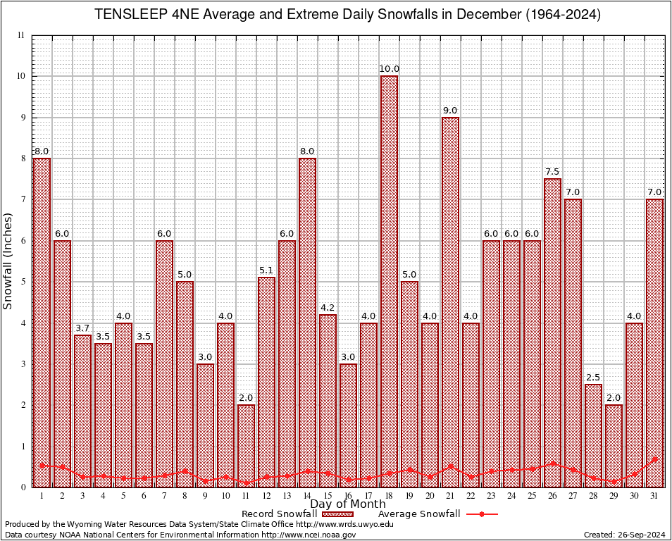 December Average and Extreme Daily Snowfall AMounts (1964-2024)
