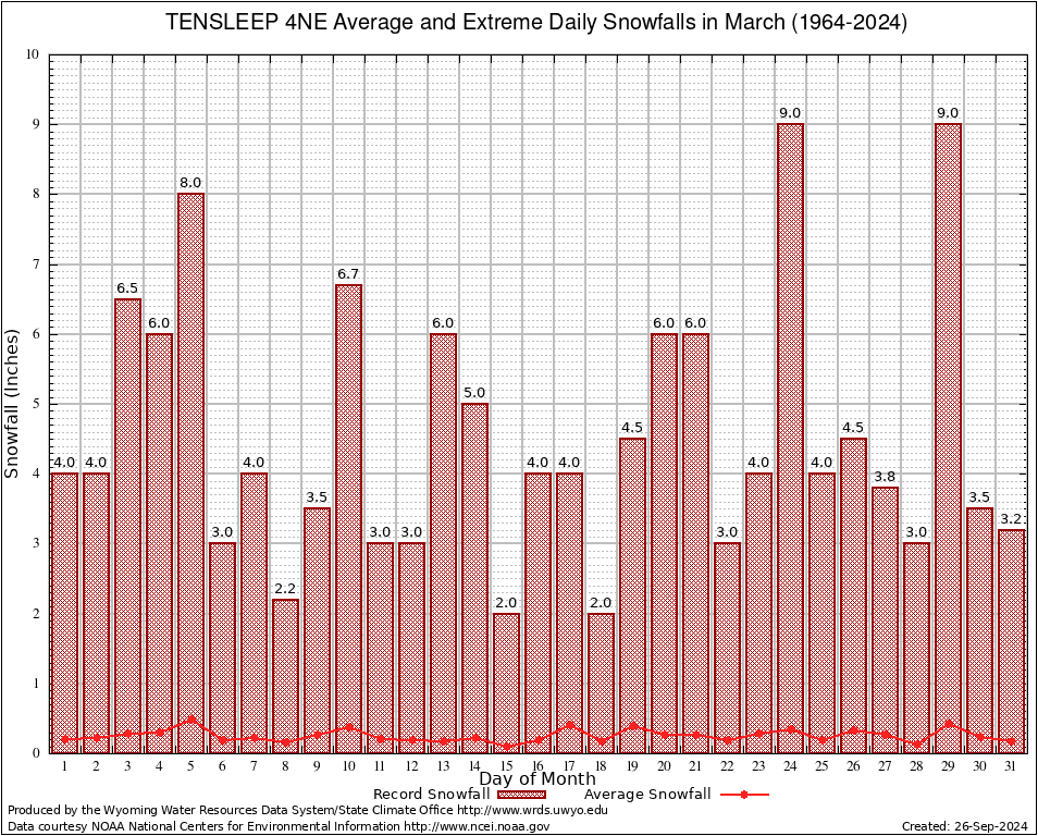 March Average and Extreme Daily Snowfall AMounts (1964-2024)