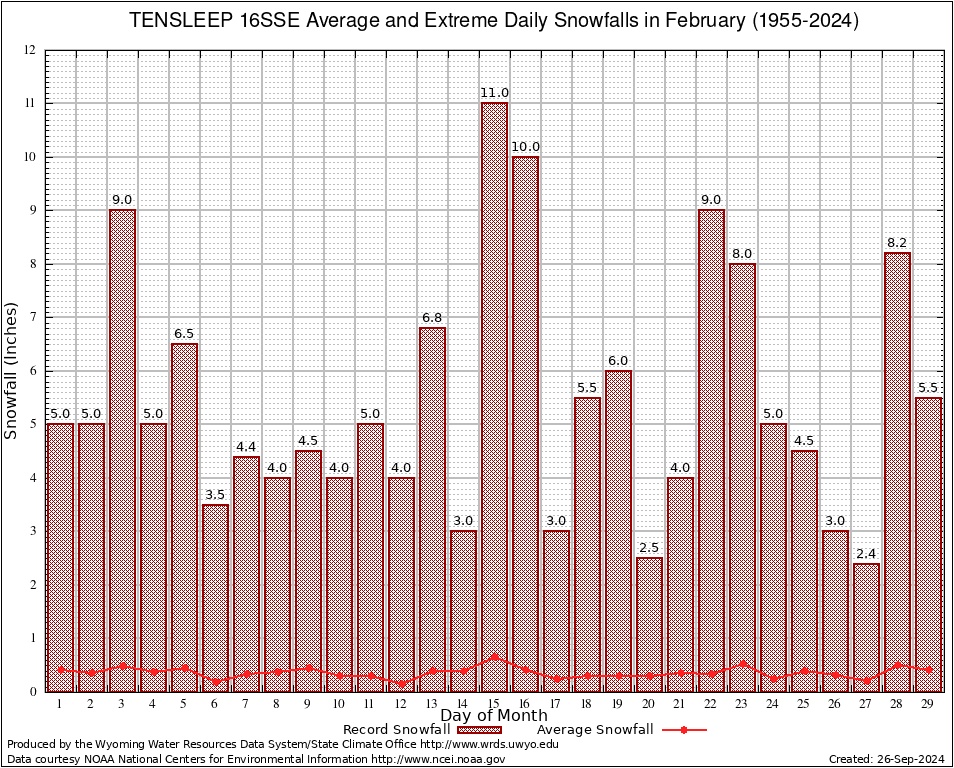 February Average and Extreme Daily Snowfall AMounts (1955-2024)