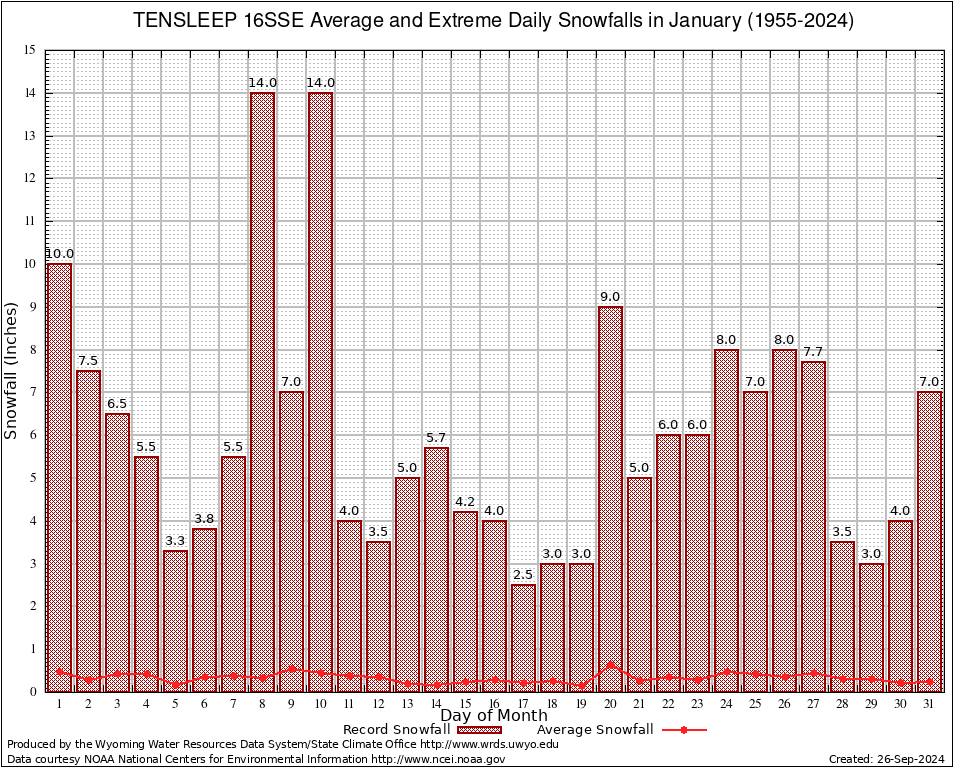 January Average and Extreme Daily Snowfall AMounts (1955-2024)