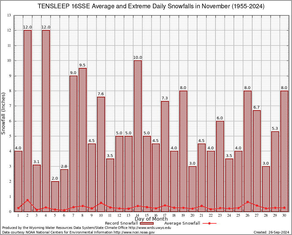 November Average and Extreme Daily Snowfall AMounts (1955-2024)