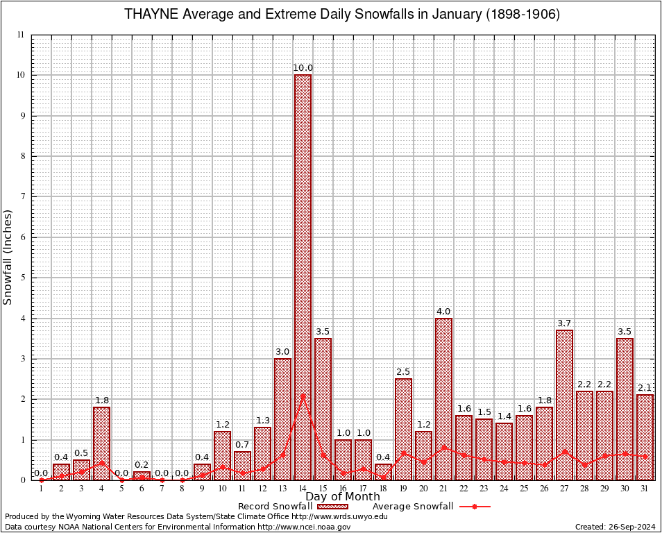 THAYNE (488868) January Average and Extreme Daily Snowfall AMounts (1898-1906) To index page for THAYNE