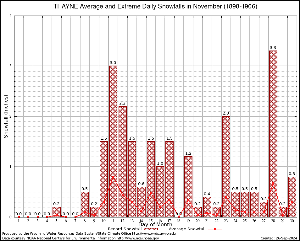 THAYNE (488868) November Average and Extreme Daily Snowfall AMounts (1898-1906) To index page for THAYNE