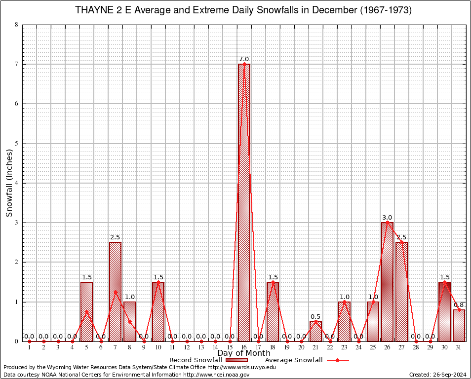 THAYNE 2 E (488870) December Average and Extreme Daily Snowfall AMounts (1967-1973) To index page for THAYNE 2 E