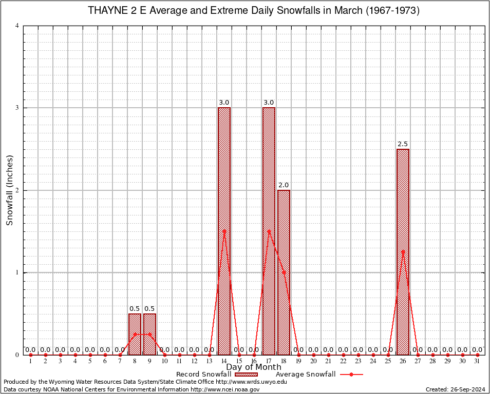 March Average and Extreme Daily Snowfall AMounts (1967-1973)