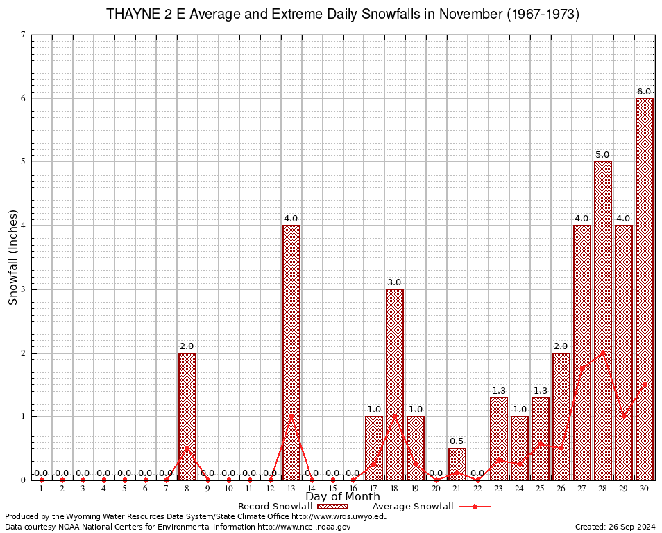 THAYNE 2 E (488870) November Average and Extreme Daily Snowfall AMounts (1967-1973) To index page for THAYNE 2 E