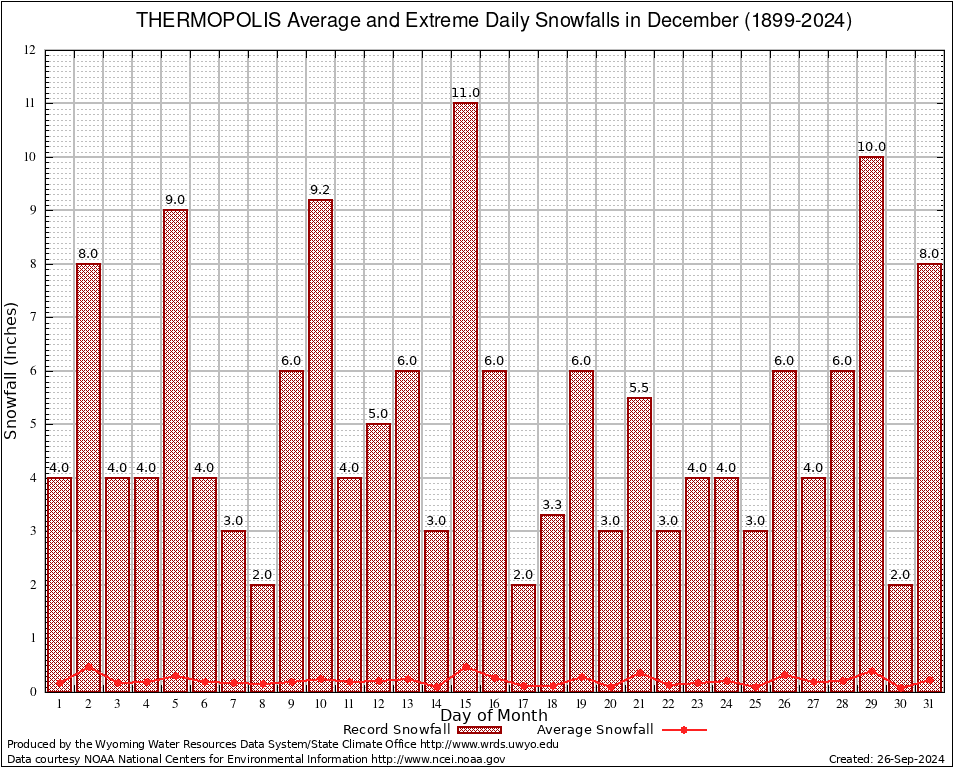 December Average and Extreme Daily Snowfall AMounts (1899-2024)