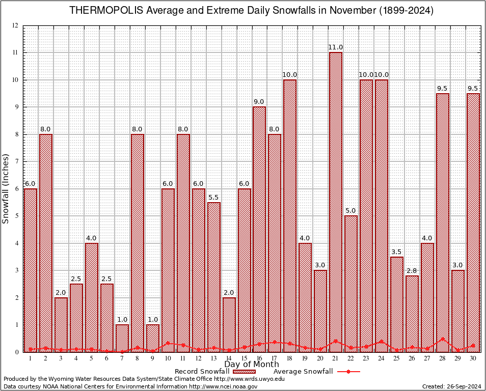 November Average and Extreme Daily Snowfall AMounts (1899-2024)